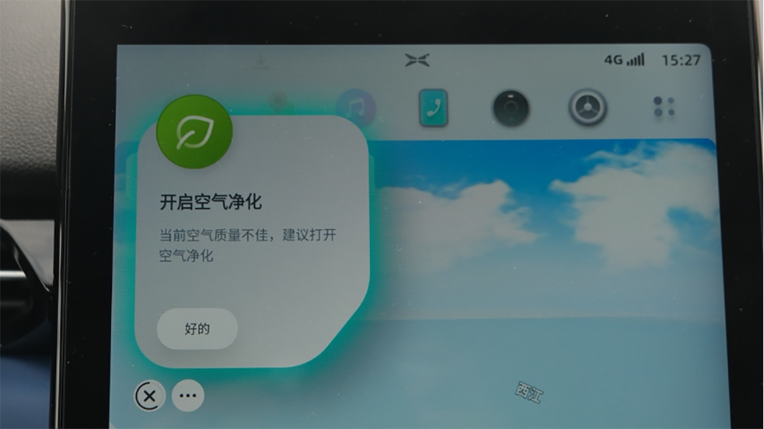 第二个,它能读懂你在干嘛,给你合适的意见。例如,你在车内抽电子烟(小朋友请勿模仿),或者开着车窗走在烟尘滚滚的地方,智能助理小P会主动询问你是否要打开空气净化。