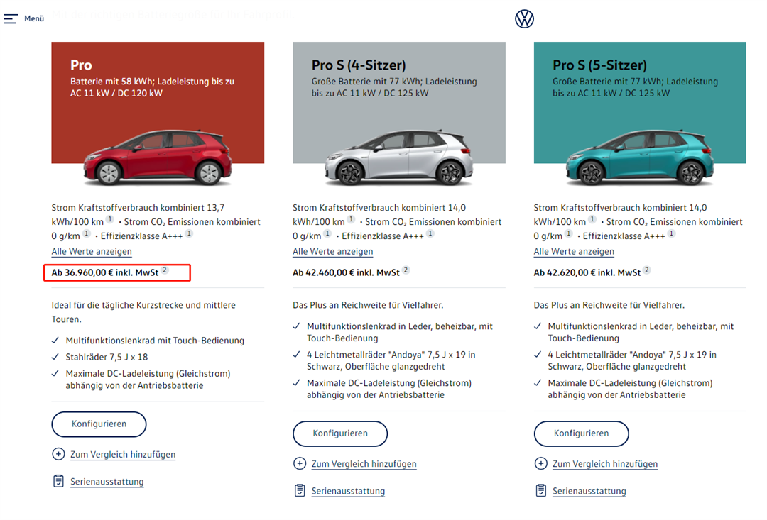 图:海外大众ID.3售价