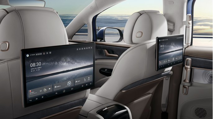 手机和后面两个头枕屏也能进行互联共享,甚至头枕屏还自带可升降摄像头,能随时确认后排乘客动态或者开启线上会议等。
