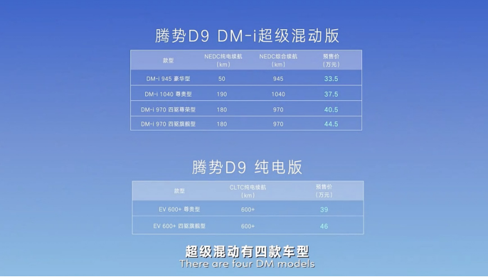 近段时间比亚迪在新能源领域的出色表现大家是有目共睹,而比亚迪也是更早宣布停产纯燃油车的车企,所以自然而然,这台腾势D9在动力方面也是跟上了脚步,它拥有DM-i插混版本和EV纯电版本。