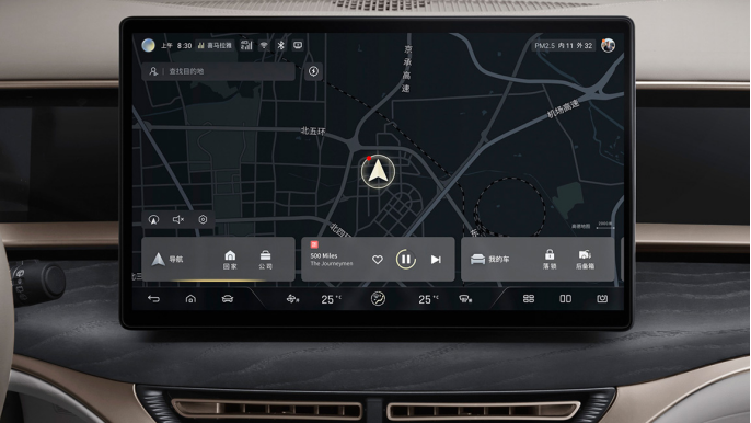 而在整个腾势Link智能交互座舱里面,座舱交互是比较有创新的,例如中控地图信息能分享给其他屏幕。