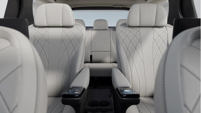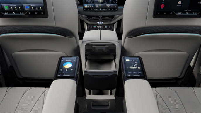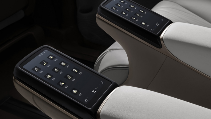 而配置方面也很丰富,例如二排座椅扶手上分别配了一个独立多媒体控制屏,里面可以控制座椅10向电动调节、10点式座椅按摩、调节空调等功能。