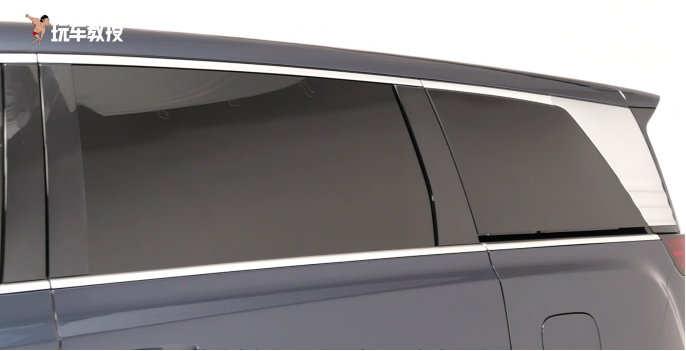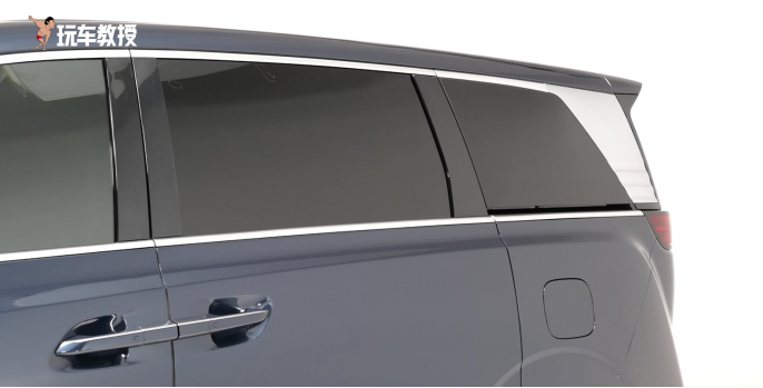 细节方面也是挺有意思的,包括D柱的饰板比较粗壮,从而又提升了一些豪华感。另外,侧滑门的滑轨和车窗融合在一起了,而像很多MPV车型把滑轨设置在车身这里,那么这种设计让车侧更加的简洁。