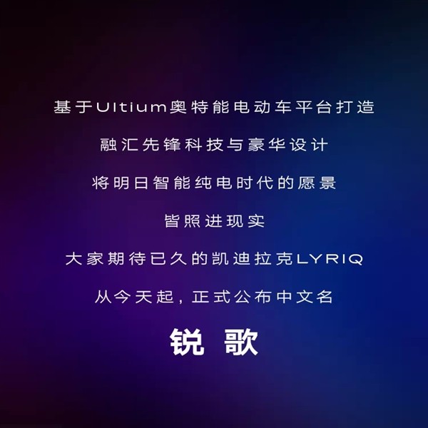 在再次启动预售的同时,官方还正式公布凯迪拉克LYRIQ中文名,名为“锐歌”。而当此中文名一出,也引发消费者的热议,毕竟相较于此前以英文加阿拉伯数字结合的CT、XT系列命名有很大出入,提不上“国际范”的感觉。
