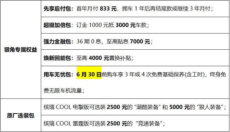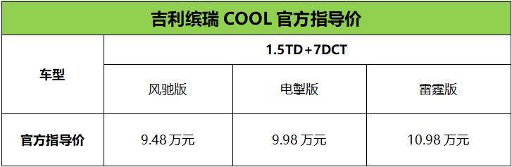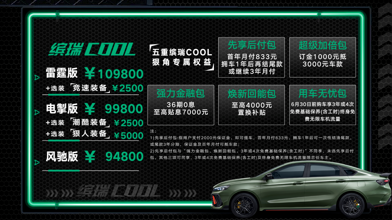 在公布售价的同时,吉利汽车还推出了五重“狠角专属权益”,凡购买吉利缤瑞COOL的用户均可享受“先享后付包”“超级加倍包”“强力金融包”“焕新回能包”以及“用车无忧包”等五项福利。