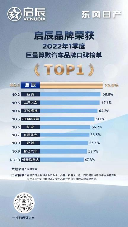 省油好开还耐用,好口碑也持续霸榜。得益于雷诺-日产-三菱联盟雄厚的技术支撑,东风日产启辰共享东风日产研发、制造等全价值链体系资源,沿袭世界领先的造车标准,旗下车型以优异的品质多次获得市场认可。在近日由巨量算数公布的《2022年1季度汽车品牌口碑榜单TOP20》中,启辰以72.0%的正面评论占比,排名榜单首位,再次证明启辰大V等车型的可靠品质。除此之外,在今年3月15日发布的2021年度《汽车之家乘用车新车质量报告》中,东风日产启辰排名中国品牌新车质量表现TOP 2,值得一提的是,这是继2019年、2020年连续获得《汽车之家乘用车新车质量报告》中国品牌新车质量表现排名NO.1后,启辰连续三年位居质量表现榜前两名。