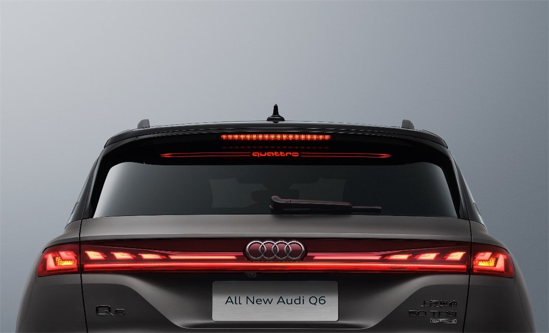 车尾造型给人一种非常运动的视觉感受,首先映入眼帘的是,两侧智能矩阵式LED贯穿式流光尾灯组,它藏身着奥迪Q6独具一格的魅力。