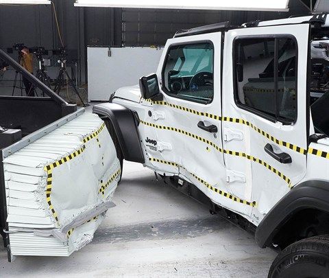 在大家的印象中,像牧马人这种非承载式硬派越野车的安全性应该不用让人担心。但是在此前,牧马人曾经在IIHS 25%偏置碰撞测试中翻车过,字面意义上的。这导致牧马人总体评价只拿到了一般(M)。