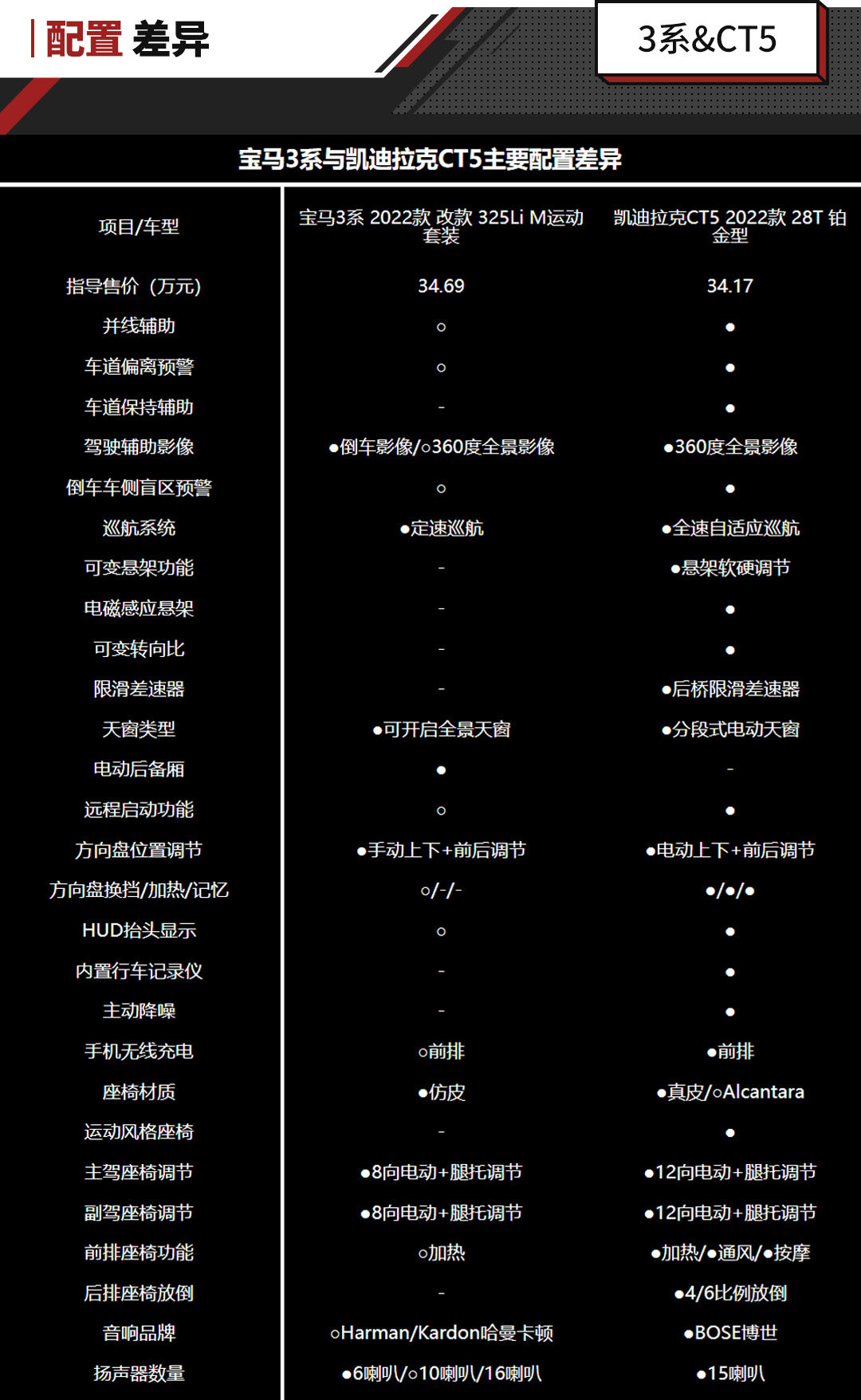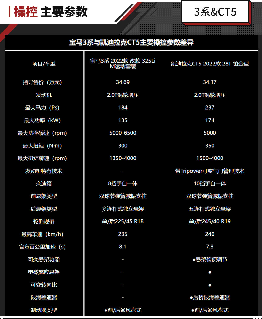 既然两款车都是后驱设定,对于操控一定有着相当的执著,宝马3系就不必说了,不过,我们选择的是325Li,按时“行家”的说法,只有动力最强的330(328)才叫宝马3系,325和320只是退而求其次的产物,更何况是加长了的325Li,不过你也别小瞧了325Li,毕竟宝马的调校精髓还是继承了的。凯迪拉克CT5就显得很高调,尤其是硬件方面,接下来,我们先就一些关键参数列表一下。