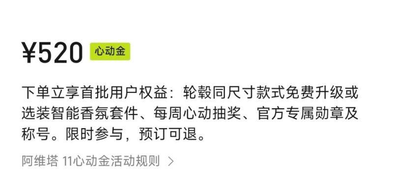 除此以外,新车正式开启预定,新车订金520元,下单享首批用户权益,轮毂同尺寸款式免费升级或选装智能香氛套件、官方专属勋章和称号、参与每周心动抽奖活动一共三个权益。