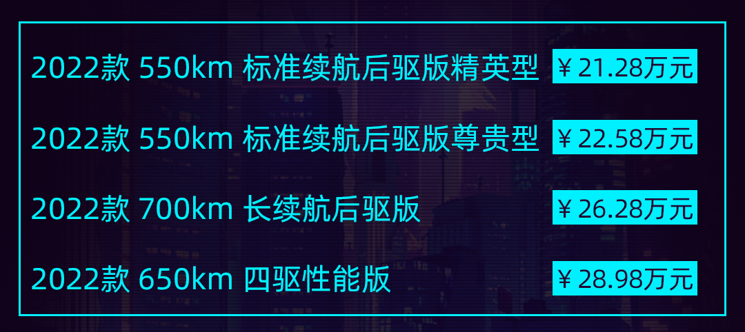 而在续航方面,标准续航版车型搭载一块61.4千瓦时电池组,CLTC工况下续航里程为550公里;长续航版和四驱性能版车型搭载一块82.5千瓦时电池,CLTC工况下续航里程分别为700公里和650公里。电池类型均为磷酸铁锂刀片电池。