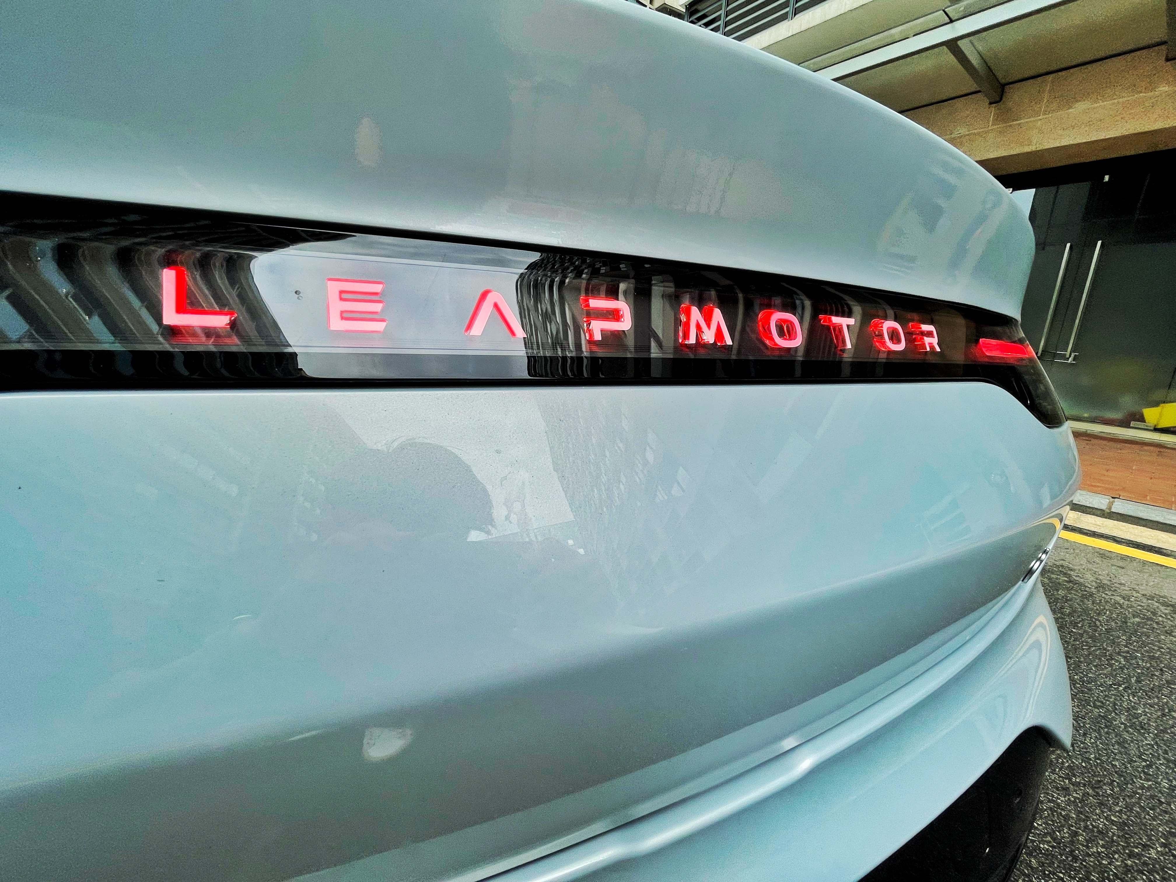 尾部简洁不失高级感,虽然没采用当下流行的贯穿尾灯样式,但发光的 Leapmotor Logo 标徽搭配上燻黑的灯具涂装也一样有很出众的视觉效果。当刹车时,黑色灯罩内浮现出红色光晕,还颇有几分保时捷的既视感。