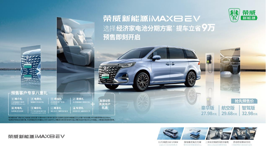 与此同时,“全球首款纯电MPV”荣威iMAX8 EV正式开启线下预售,推出豪华版、航空版、智驾版三款配置,并提供驭光银、珠光白、星云蓝、荣麟灰4款车色选择。其预售价格区间为27.98万元-32.98万元。作为中国荣威在新能源MPV市场的重磅之作,荣威iMAX8 EV通过以在豪华舒适性与安全性能上的全方位越级品质,为用户打造“前后皆是头等舱”的尊享体验。同时,其550km-570km的长续航里程与30分钟电量从30%到80%的快充速度,可满足用户多场景出行需求。