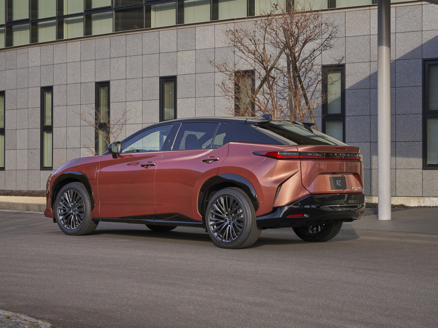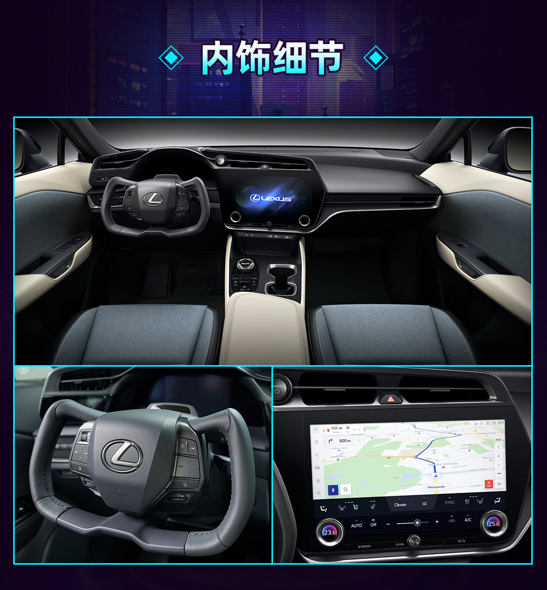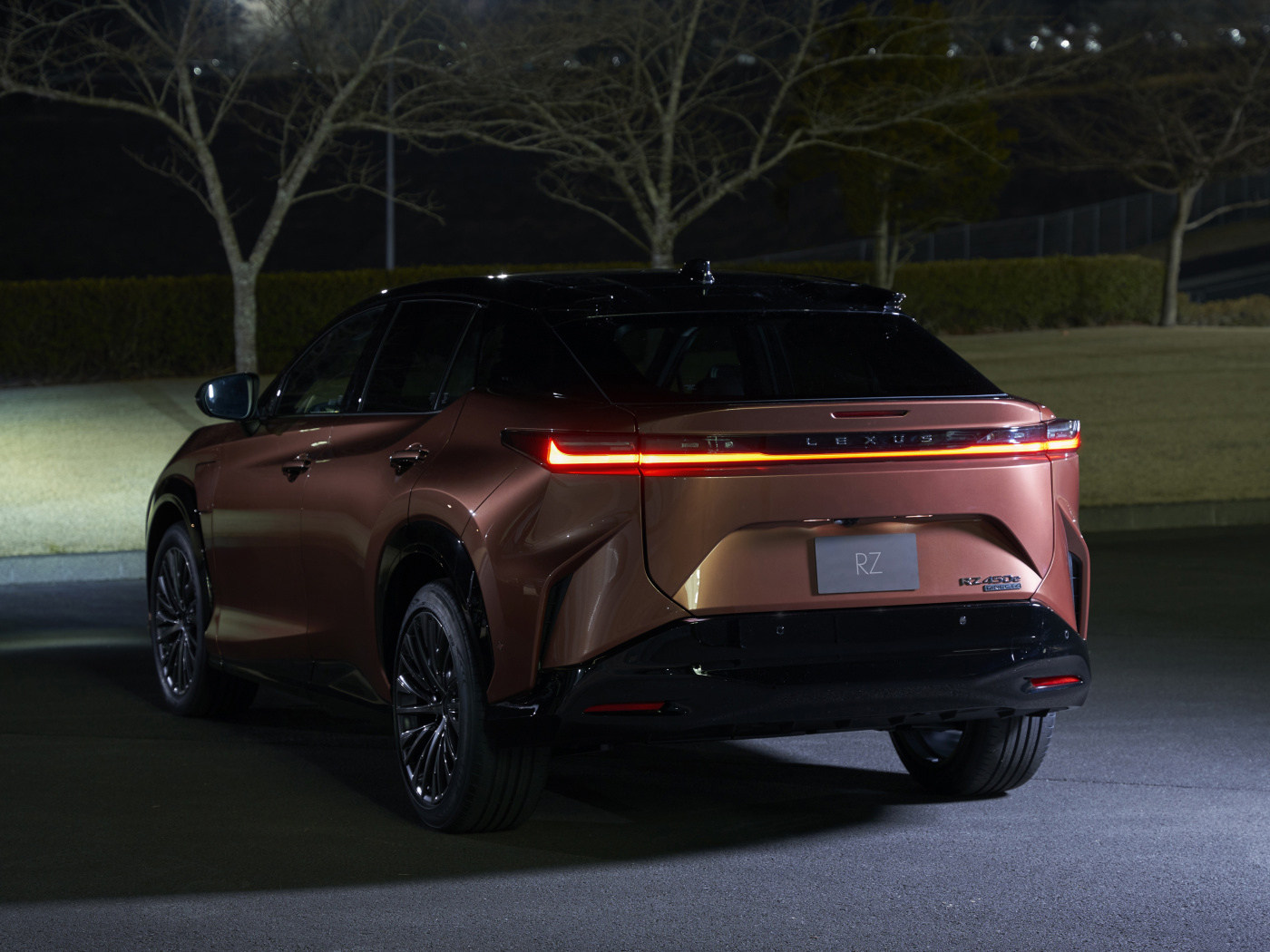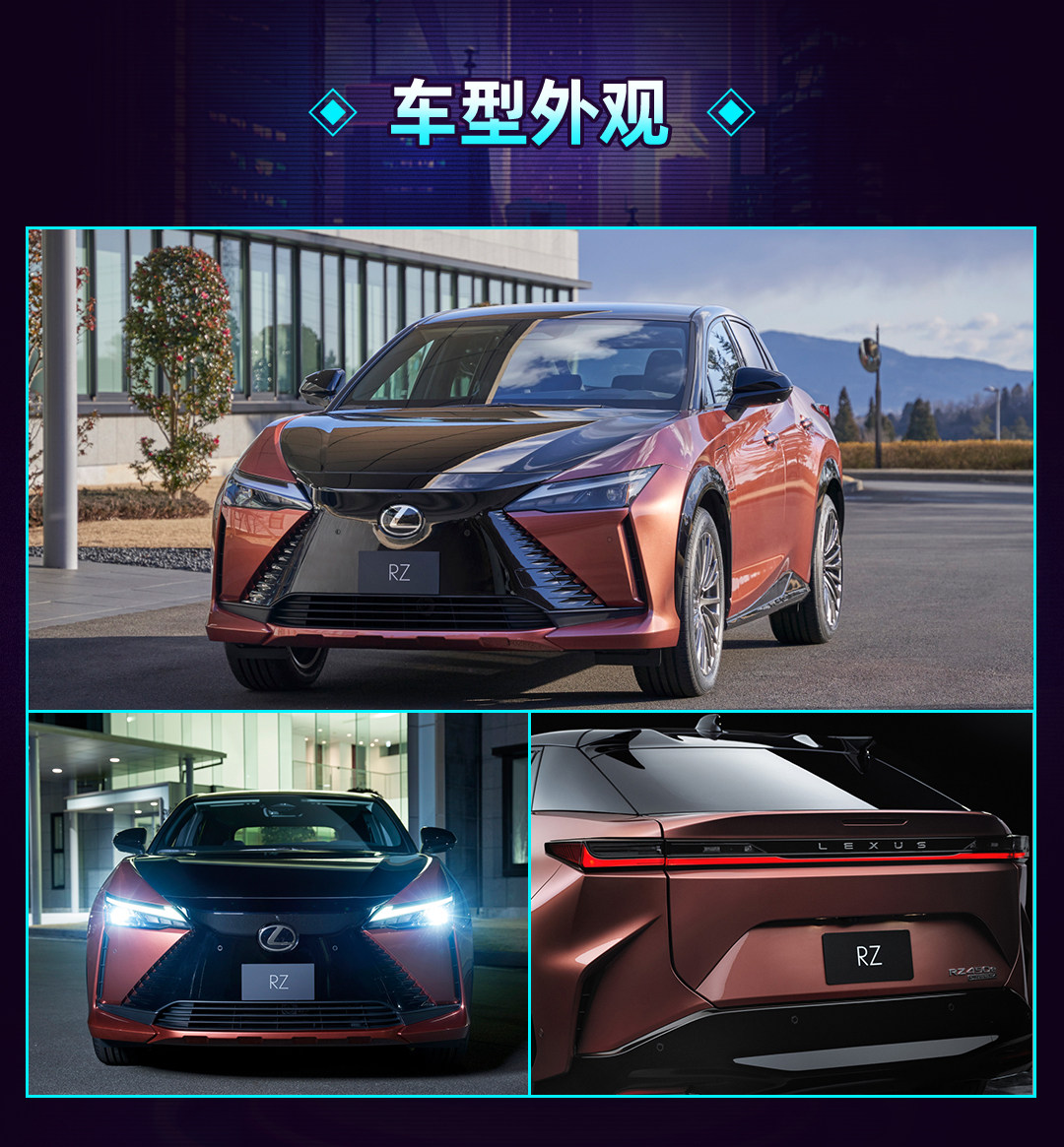 外观方面,雷克萨斯RZ设计理念源自于早期的雷克萨斯LF-Z Electrified概念车,不过像纺锤式前脸、闪电式LED灯带等家族标志性设计依旧是得以保留。