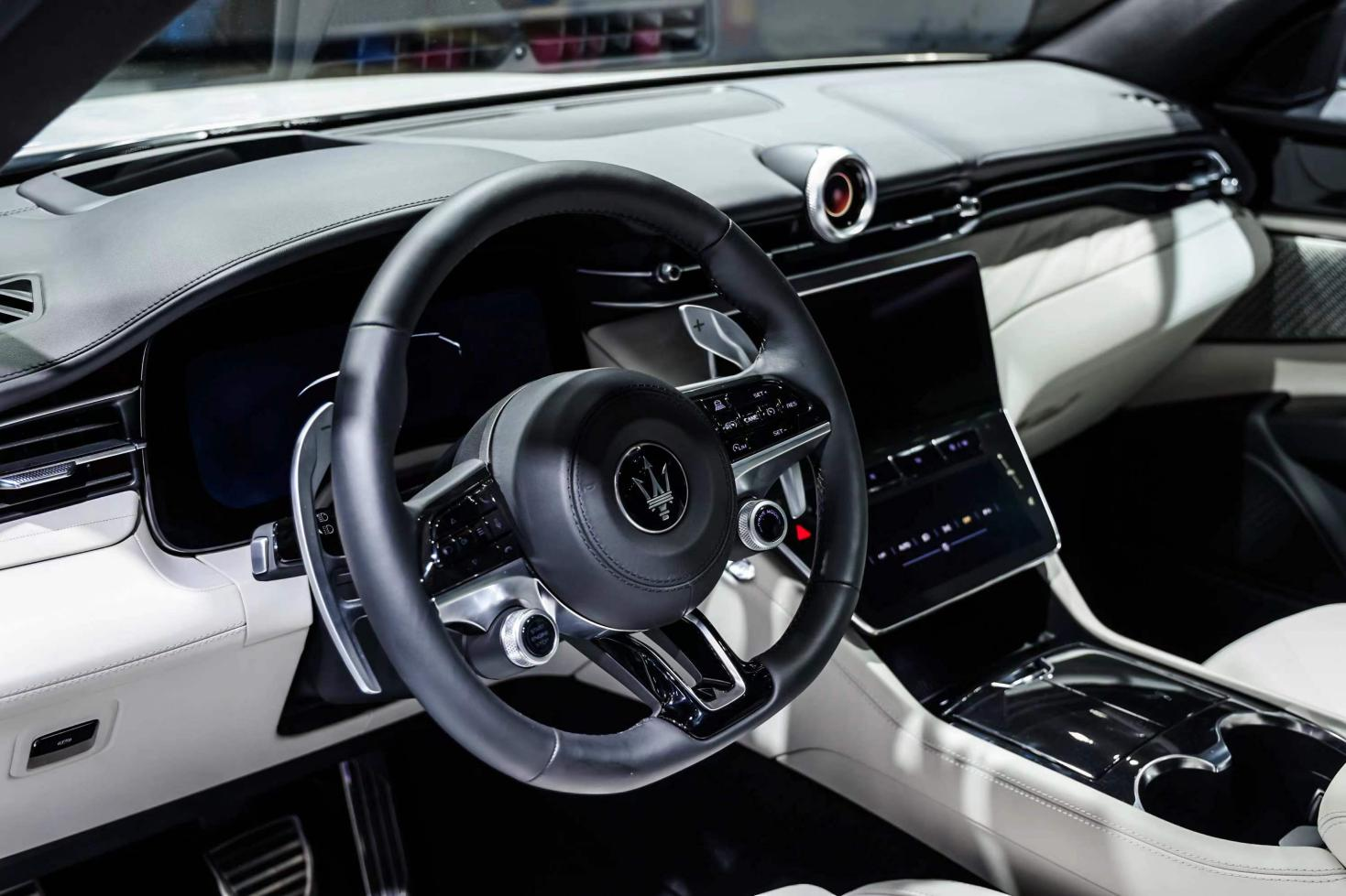 承袭玛莎拉蒂纯正基因,展台上的Grecale Modena版傲然伫立,主角风姿一眼即识。首先映入眼帘的便是其全新交织而成的首发色——幻彩灰(Grigio Cangiante)车身涂装,灵感源自夏季明快的清新光线以及内心深处的静谧之境——明亮的浅琥珀色背景搭配偏蓝色的冷云母色,在保持淡雅科技感的同时,又充分展现了原有色彩的美感,以久经钻研的着色工艺营造出别出心裁的视觉效果。