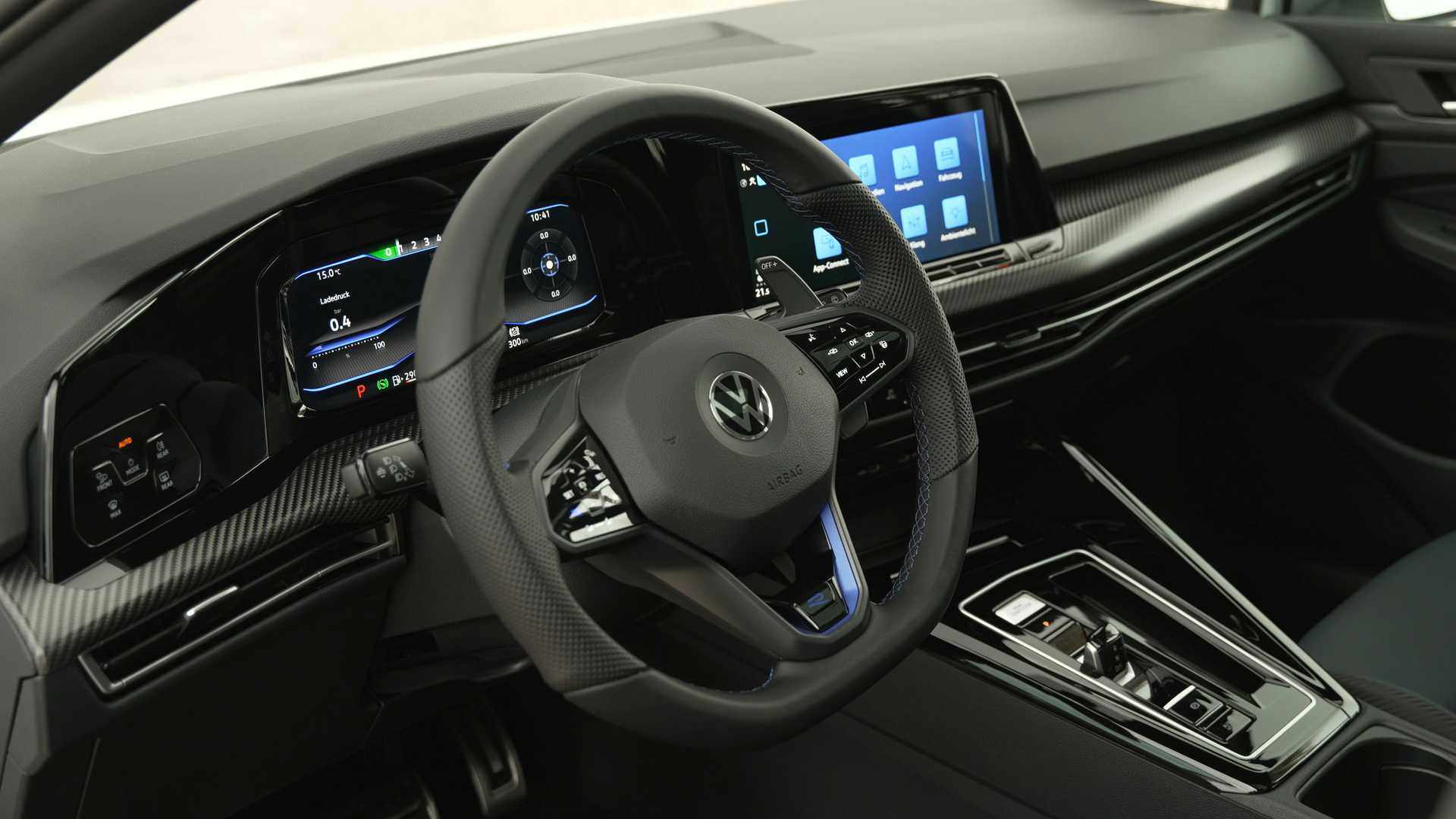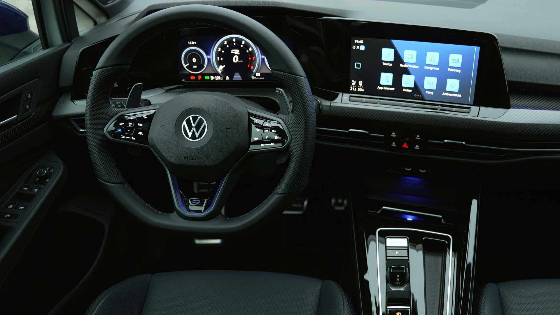 新车座舱部分采用哑光黑配色为主色调,细节之处嵌入蓝色“R”字母标识,以表明自身的特殊身份。