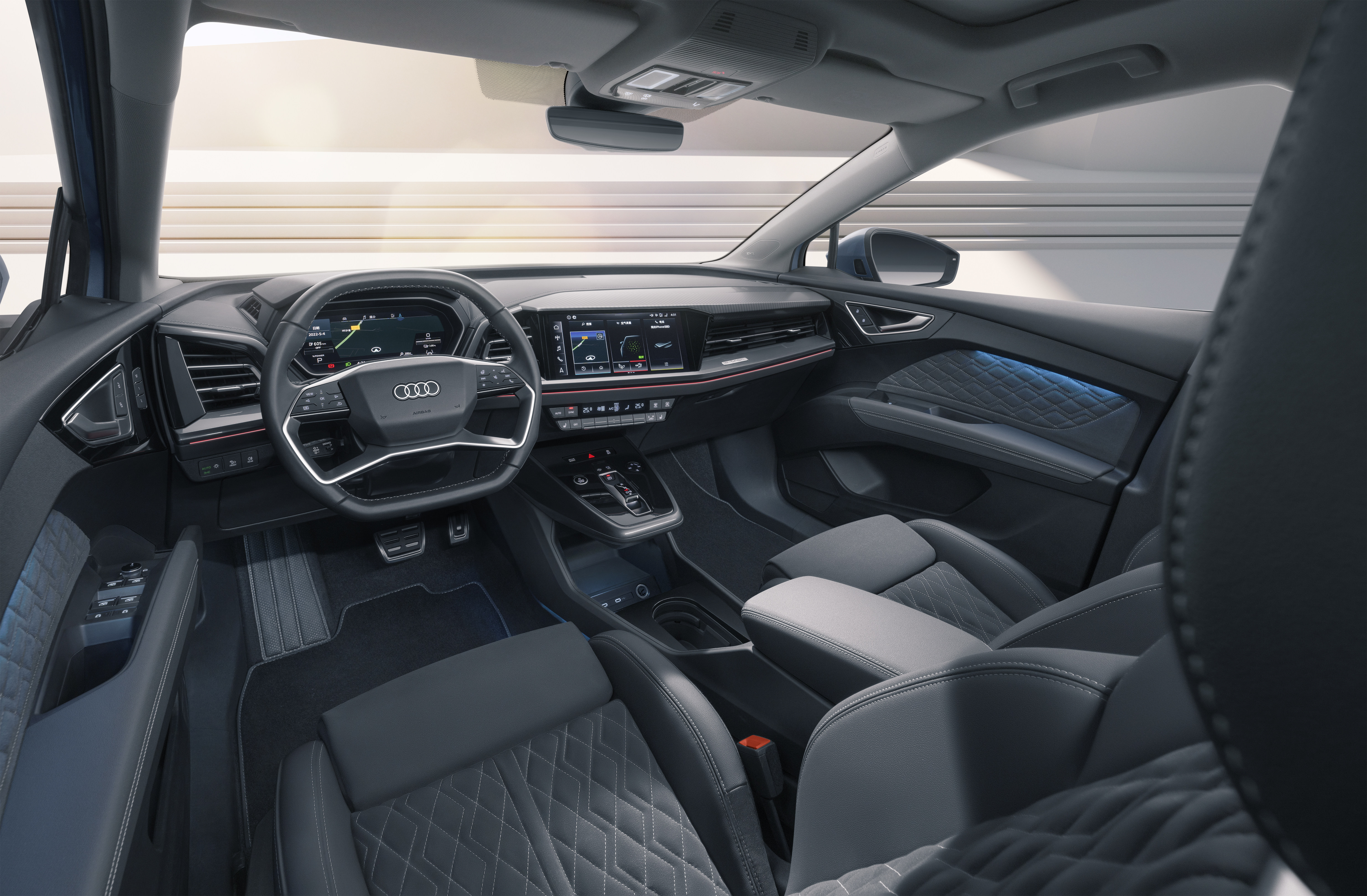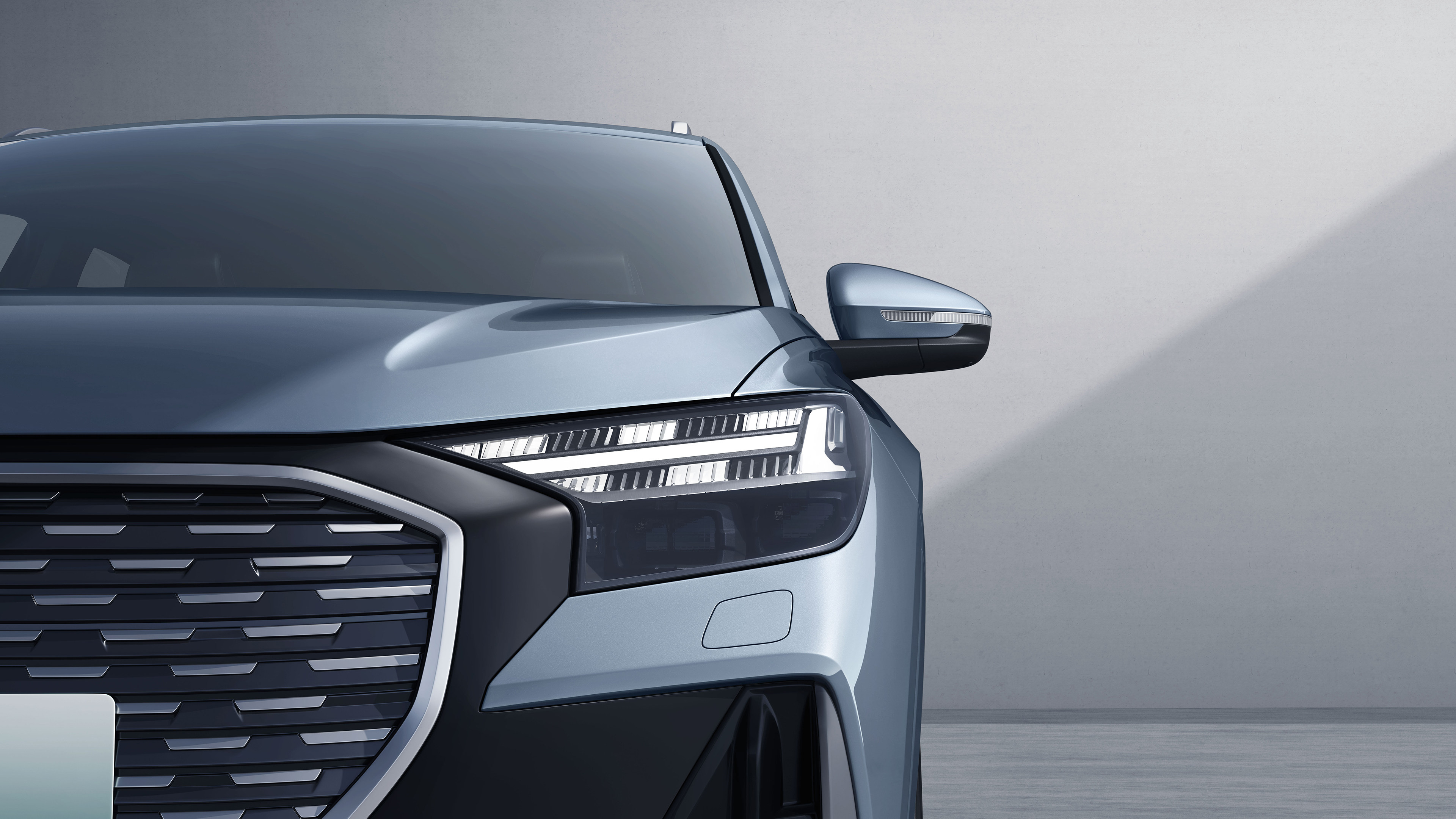 奥迪Q4搭载悬浮式矩阵LED大灯组,并辅以行业首个数字日间行车灯技术,可在4种灯光签名进行自由切换。奥迪Q4搭载中国市场专用的前排运动座椅,提供带有打孔设计的珠光nappa高级真皮+Hoxton材质及采用钻石绗缝的Dinamica+Hoxton材质等高级面料可供选择。奥迪Q4 e-tron还提供饰有奥迪A8L霍希版同款钻石缝线的车门板设计,Dinamica材质搭配双缝线彰显奥迪独到的精致豪华美学设计。