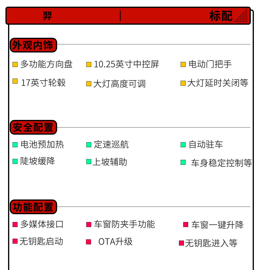 咱们就重点来看看高功率版本,其实入门的2022款 标准续航精英Pro版(14.68万)就标配了倒车影像、定速巡航、10.25英寸全液晶仪表、车联网、OTA升级、电池预热、胎压显示等一些比较基础的配置,虽说已经能够满足日常使用需求,但是智能化体验就稍微差了一些。