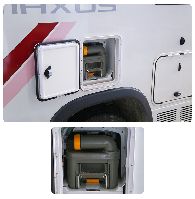 左侧后轮上方打开是洗手间的专用灰水箱,该灰水箱内带有专用的滤芯过滤,以便异味的产生。这一点设计值得好评。