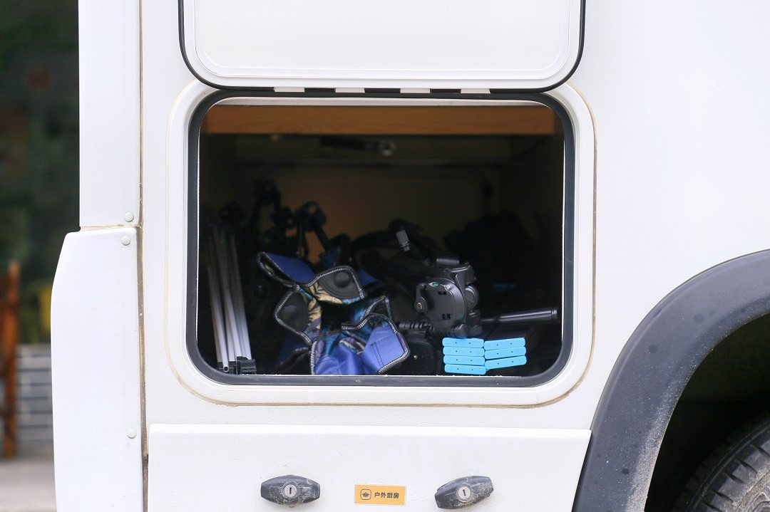 在副驾侧面中间位置,形似油箱口的盖子是清水箱的阀口。车辆配有专门的接水管,并带有一个户外洒水头。当拿到这一台房车时,工作人员介绍,在清水箱满水的情况下可供4-5人15分钟左右舒服的洗浴时间,其清水箱的储水容积也能够满足远途出行的露营需求。