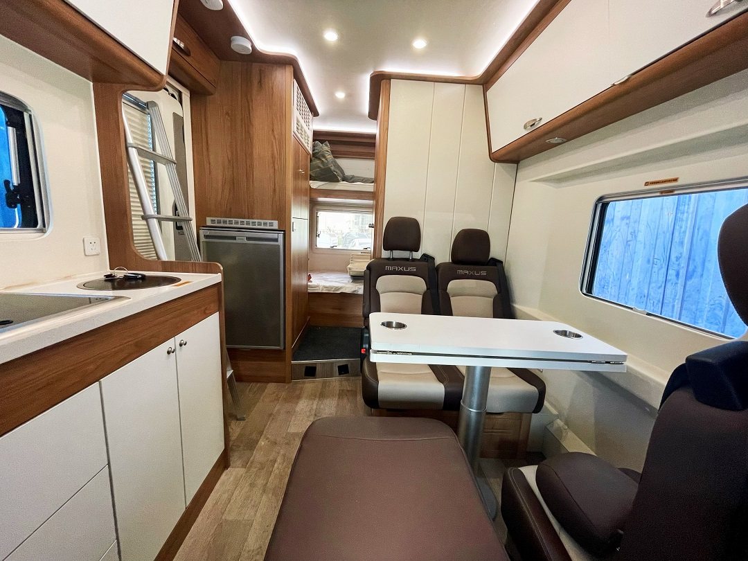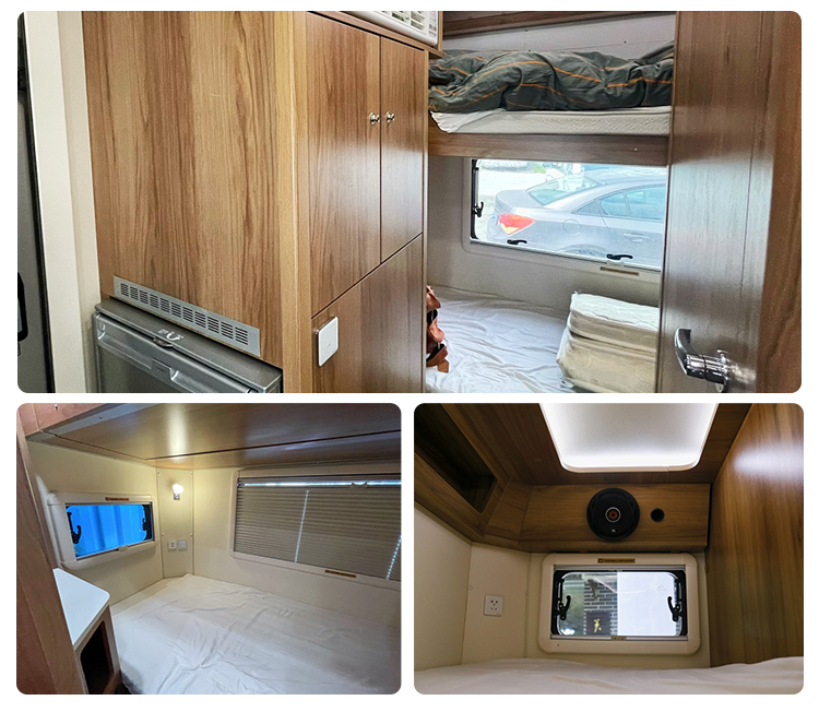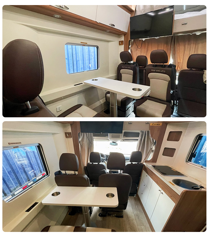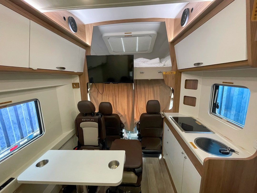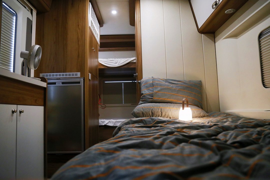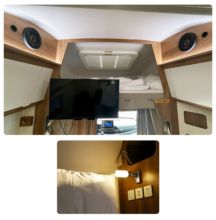 首先“浅聊”一下家居布局,车顶上方是可容纳两人休息的双人床,这算得上是车厢内的一居室。左右两侧以及上方的大尺寸天窗能够带来足够的透光性,不会显得太过压抑。并且带有的控制车内灯光的触控开关以及阅读灯还有插座。