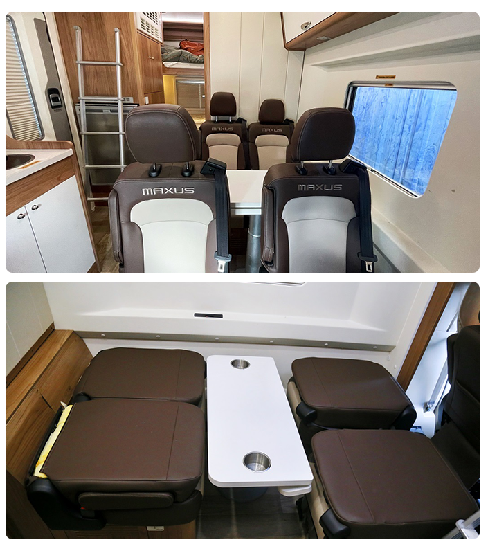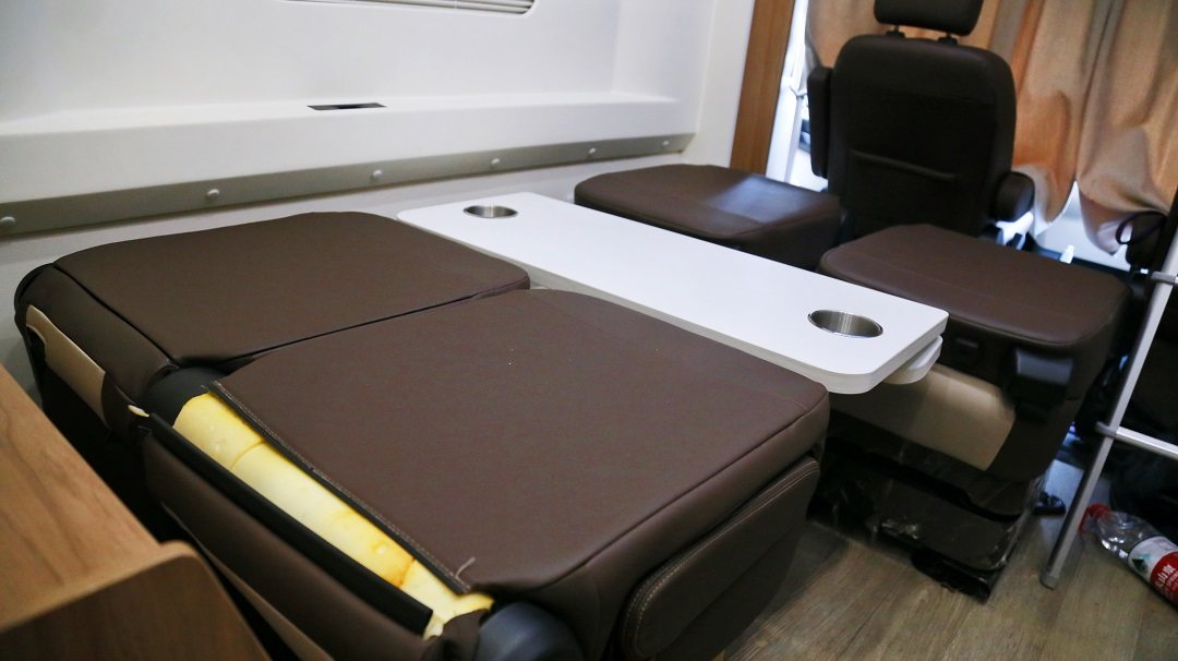 客厅其实是四座椅的会客区加上生活家居的装潢。但其实,这个会客区还能够摇身一变“化身”为主卧床,具体操作步骤是先将四座椅头枕拆下然后放倒座椅背部,紧接着控制电动开关使其“茶几”下降。