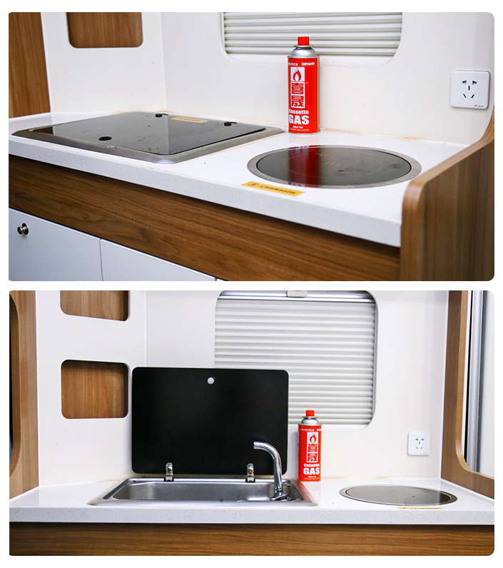 茶几对面储物柜台设有洗手池和800W功率的电磁炉,满足相应的烹饪需求。采用熬、煮、闷之类的“慢烹饪”方式会太过度的消耗卡斯炉气罐,那么这个电磁炉倒是个不错的选择。
