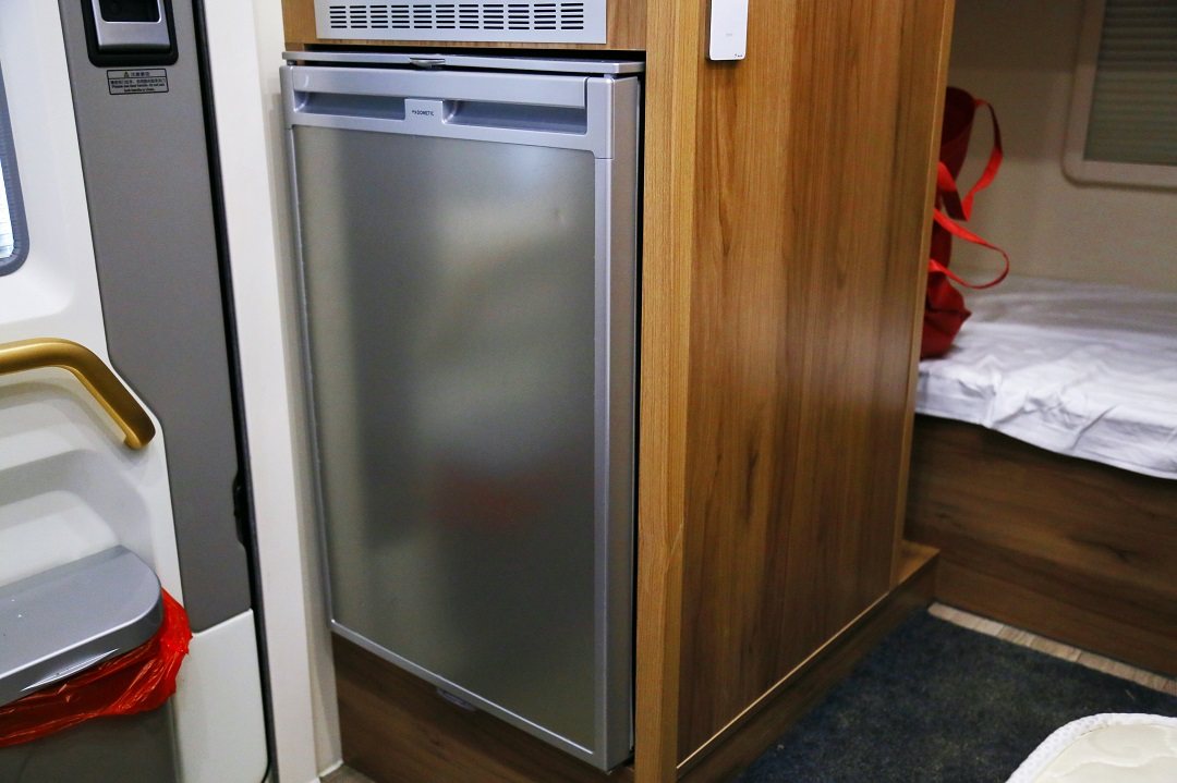 在往后看是一个独立的单侧门冰箱,带有冷冻和冷藏的功能。而上方是一个小型的独立空调。在实际体验当中,不论是冰箱亦或是空调的制冷效果都能达到咱们日常家用舒适度的效果。