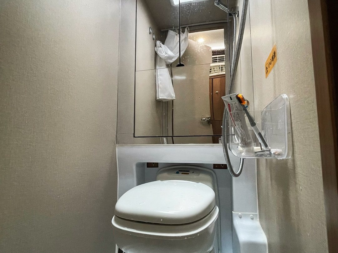 空调对面是一个占地面积约为一平米的洗浴间,配有洗浴化妆镜和花洒以及洗漱池。其它方面这里提两个注意事项: