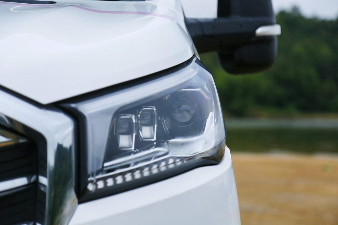 以二维的视角看向车尾俨然就是个正方形。车顶布有倒车影像摄像头,第一次开房车的新手小白可能需要习惯习惯以不同的视角倒车。整个灯组都设在尾部下方,车顶两侧同样设有警示光源,以便夜间光线环境不佳时观察示高和示宽的情况。