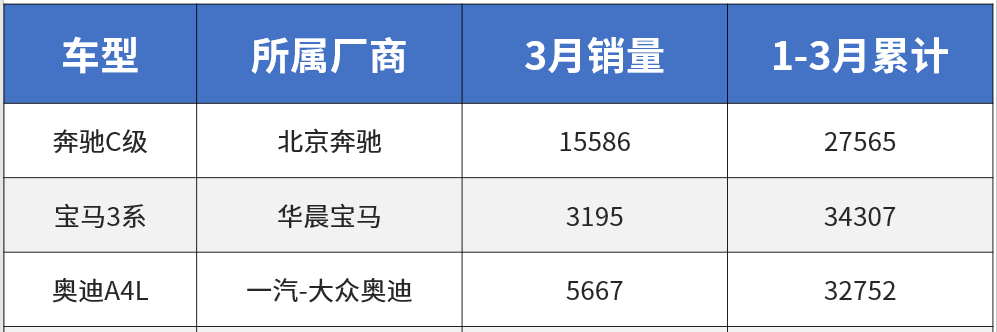 我们可以参考2022年1月至3月销量数据(4月受疫情影响较大),奔驰C级1至3月累计销量为27565辆,宝马3系累计销量为34307辆,而奥迪A4L累计销量为32752辆,从大体的销量来看,它们都没拉开较大的差距,保持在同一水平上竞争。