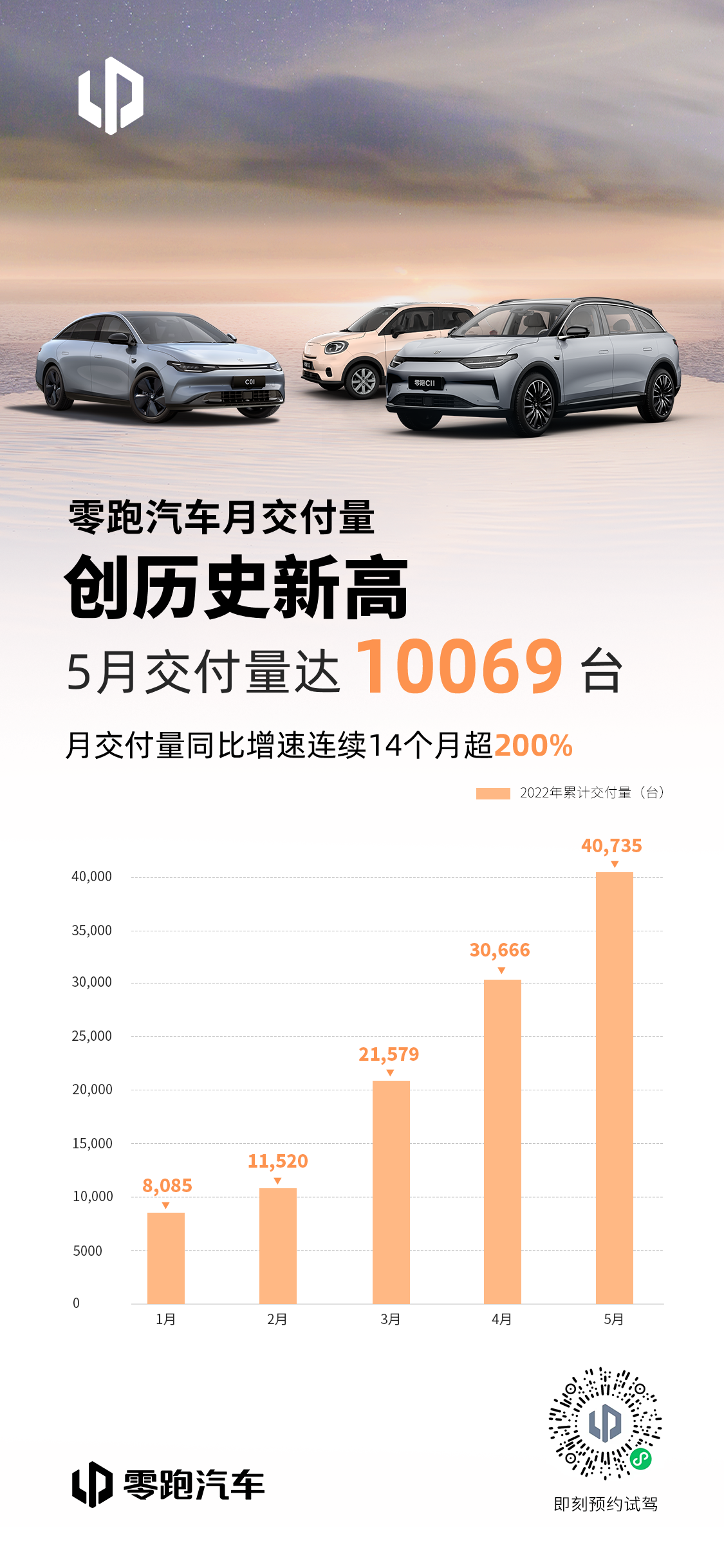 【2022年6月1日,杭州】今日,零跑汽车正式发布2022年5月交付数据,当月共计交付10069台,创历史新高,实现连续14个月同比增长超200%,成绩亮眼,稳居造车新势力第一阵营。