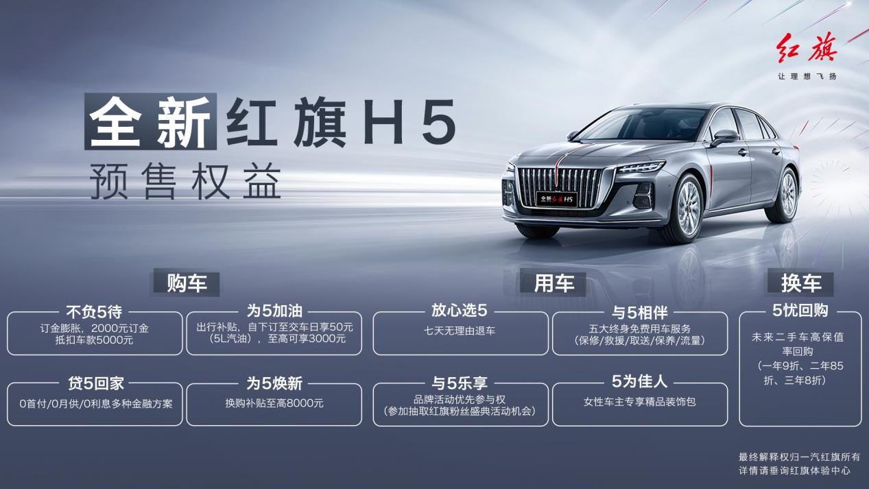 礼遇升级,用户至上。全新红旗H5为订车用户打造了覆盖“购车、用车、换车”全旅程的专属权益。在购车方面,推出了订金膨胀权益,订车用户支付2000元订金可以抵扣5000元的购车款;同时,为了缓解用户订车后在等待过程中的焦急心情,还推出了出行补贴政策,即用户自下订至交车的期间,每天可享50元的出行补贴,相当于是每天送给订车用户5L汽油。在用车方面,订车用户可以享受七天无理由退车的重磅政策,以及在“三终身一免保”服务政策基础上,升级为五大终身免费用车服务,即终身免费保修、终身免费取送、终身免费救援、终身免费保养,终身免费车联网流量。在换车方面,预售期间的订车用户可以享受高保值率的二手车回购权益,具体为一年9折、两年85折、三年8折。丰厚的用户权益凸显了红旗对全新红旗H5硬核产品实力的信心。
