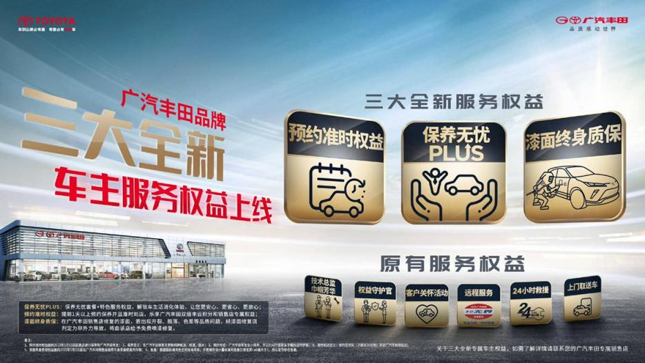 为充分满足消费者的多元化服务需求,广汽丰田联合全国销售店推出“线上+线下”全场景多元无忧服务,让消费者尊享旗舰产品的服务体验。通过丰云行APP,消费者既可以享受到“便捷、公平、安心、透明”的全新一站式数字化购车尊享服务,同时也可以享受到包含养护学堂、保养预约、维修履历查询、救援出险等功能的一站式全方位的售后服务。近期,广汽丰田更上线三大全新车主服务权益,包括保养无忧PLUS权益、预约准时权益、漆面终身质保权益,让关爱进阶,体验升级,成就更高水准的旗舰服务。