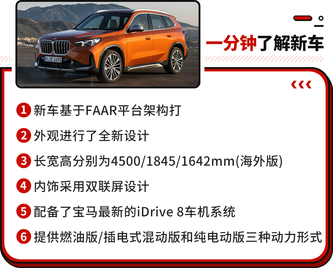 总体来看,全新一代宝马X1亮点十足,造型设计更运动的同时还加入了M运动套装,符合当下消费者的主流审美;内饰采用了双联屏设计,呈现出更豪华、更具科技感的视觉效果,摆脱现款车型廉价的布局设计;同时动力系统选择性更多,燃油版车型还加入了48V轻混系统,提升平顺性与响应速度,以及改善燃油经济性。另外,像配置、空间等方面预计也会有所提升,当然价格会不会增加就不好说了。