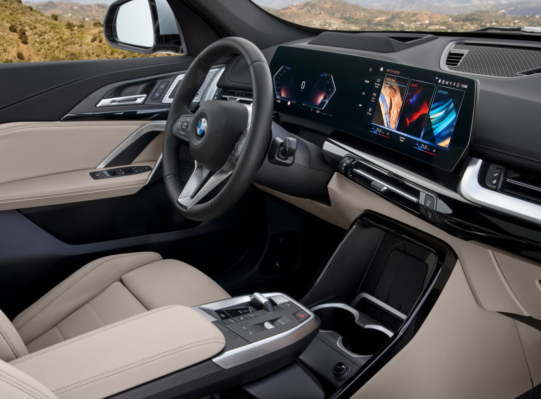 内饰方面,可以说是全新一代宝马X1变化最大的地方,也是提升最明显的地方,跳过了现款宝马3系/X3的设计风格,直接采用了宝马家族式最新的双联屏设计,配备了10.25英寸全液晶仪表盘和10.7英寸中控触控显示屏,方向盘也采用了最新设计,提升了车厢内部的豪华感和科技感。