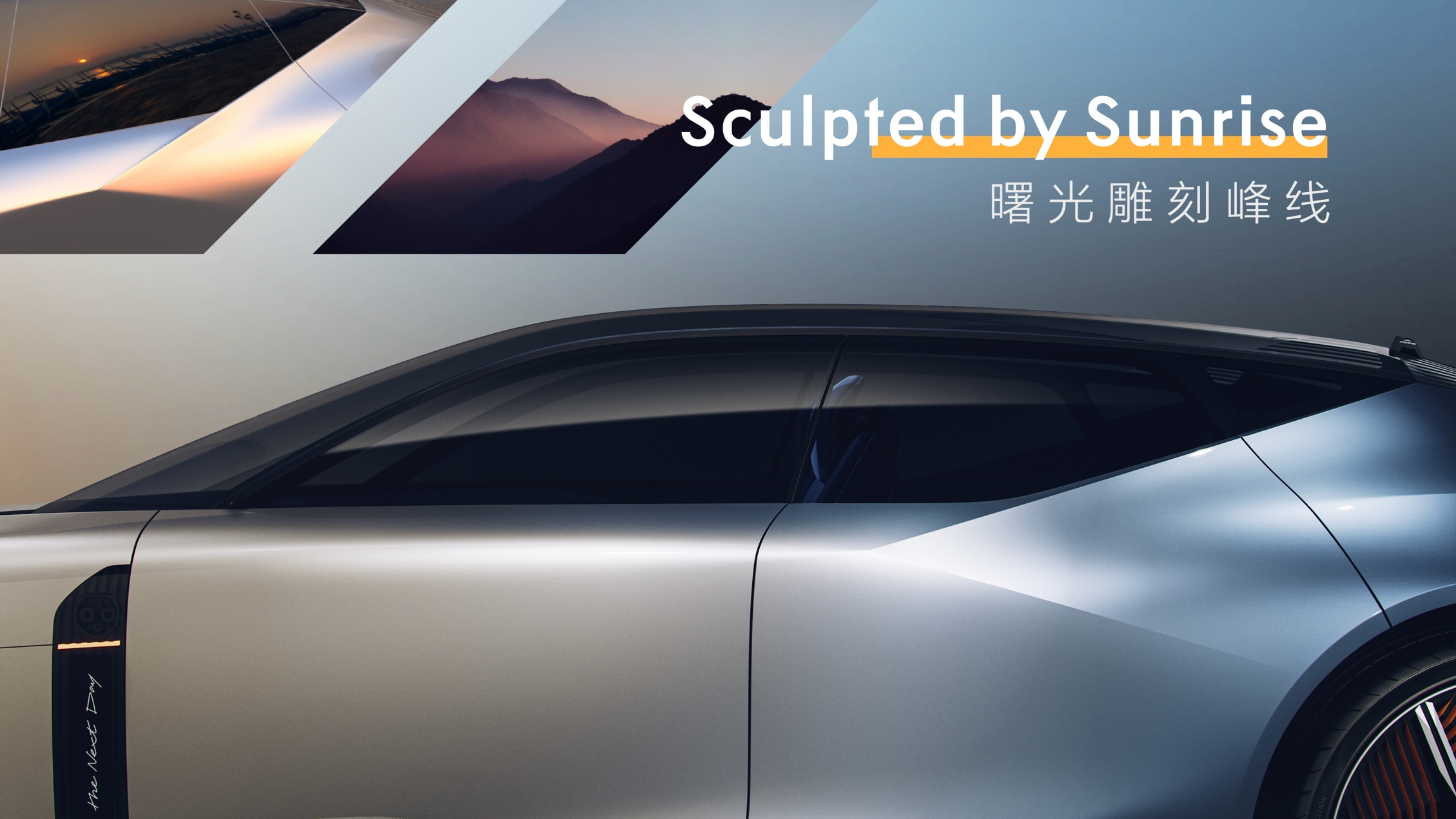 The Next Day概念车外观采用渐变涂装,呈现出从拂晓到清晨的都市光影变幻,由世界屈指可数的喷涂技师耗时数百小时手工打造,从车尾沿着车身走向车头会感觉阳光迎面而来。破晓之光日行灯、曙光雕刻峰线更增添了这种逐日而来的力量与美感。
