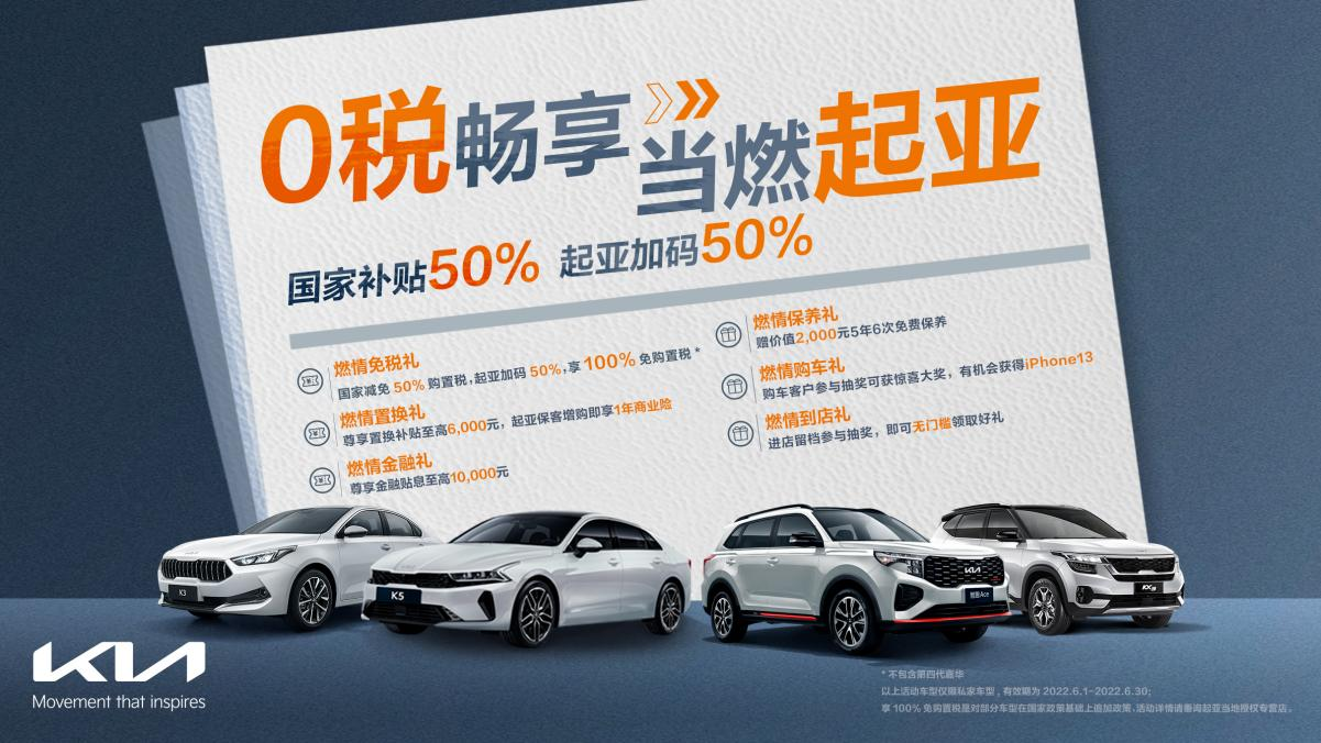 值得一提的是,积极响应财政部、税务总局《关于减征部分乘用车车辆购置税的公告》,起亚加推“0税畅享 当燃起亚”购车尊享礼遇。即日起至6月30日,购买起亚车型,即可享受包含全额购置税补贴、至高10,000元金融贴息、至高6,000元的置换补贴、保客增购享1年商业险、价值2,000元5年6次免费保养、赢取iPhone13等惊喜礼品在内的六大燃情好礼,让用户购车用车养车更轻松,收获不止加一倍的幸福感。
