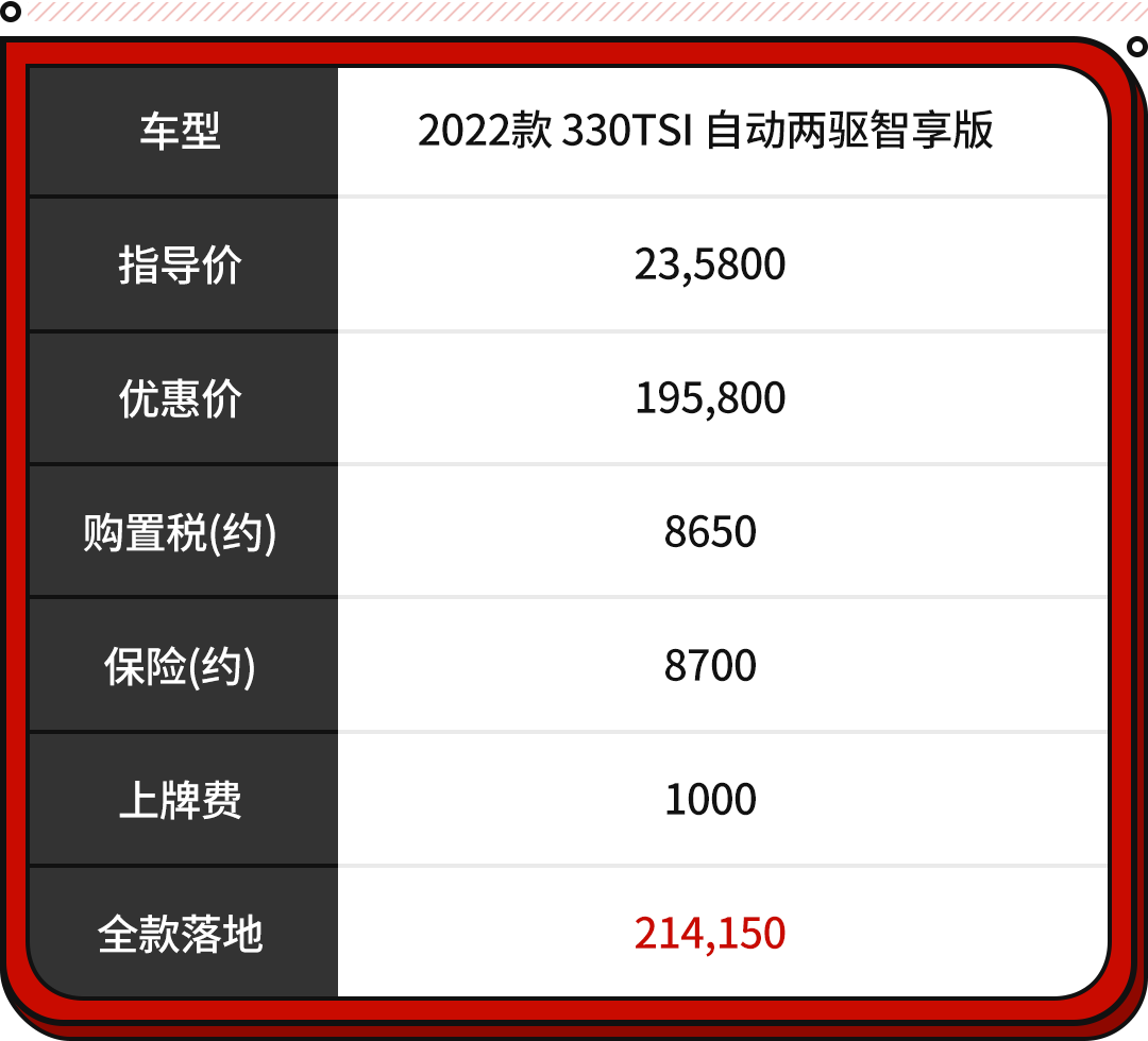 现款途观L售价区间21.78-28.38万元,终端市场也有着4万元的优惠力度,性价比也不低,不过相比于昂科威PLUS,途观L需要购买次低配才划算,因为乞丐版车型确实过于简陋,因此推荐指导价为23.58万元的330TSI 自动两驱智享版,优惠后全款落地在21.4万元左右。