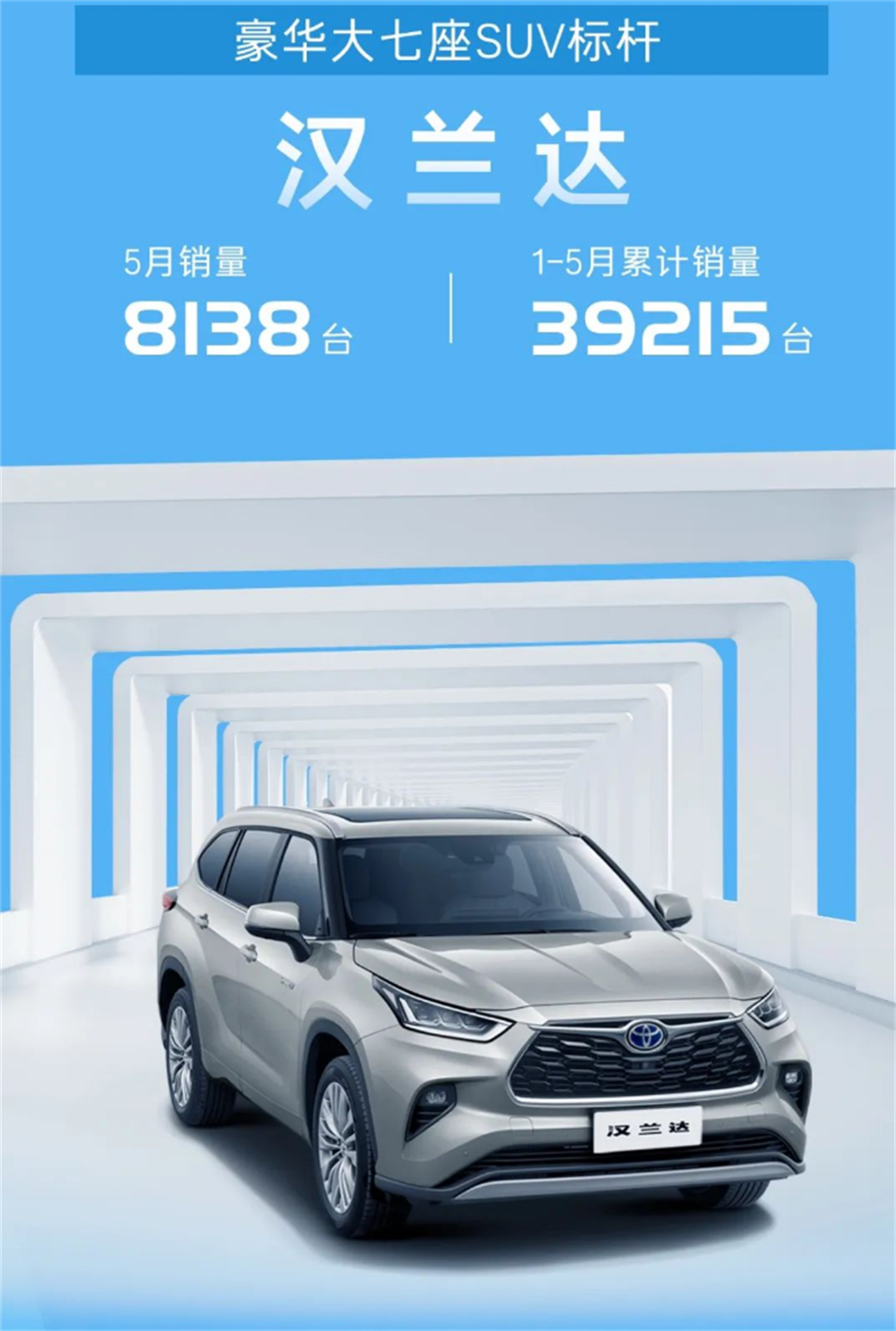 除了凯美瑞、威兰达的销量可圈可点以外,被誉为“中型SUV标杆”汉兰达也有着较为抢眼的销量表现,在今年1-5月份的终端销量为39215辆,5月单月销量为8138辆, 能在竞争颇为激烈的中型SUV市场拿到如此优秀成绩,汉兰达不负丰田盛名。