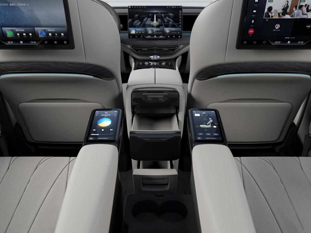 新一代宝马7系还在后排设置了31英寸的8K屏幕,车门两边有5.5英寸的控制屏,这个在腾势D9第二排座椅的扶手上也有配备。而电车这边,特斯拉和蔚来反而会把屏幕做到得比较克制。