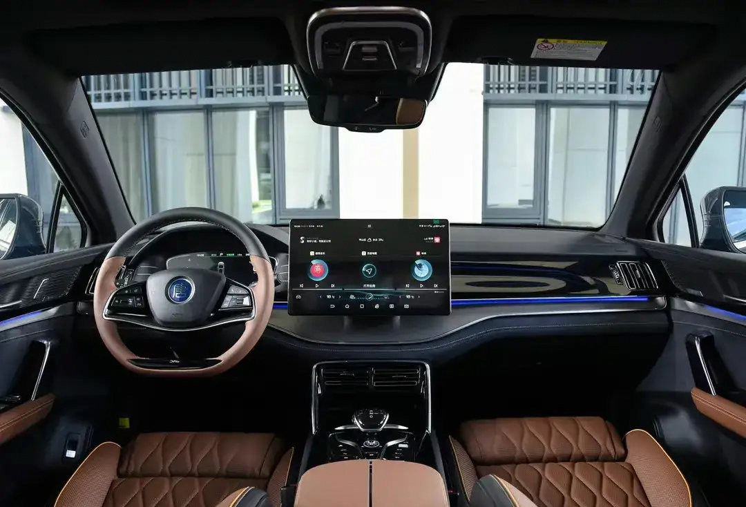 新款唐DM-p的内饰和其他唐DM车型相比没有太大变化,依然保留了熟悉的比亚迪布局。大尺寸可旋转中控屏依旧占据了整个中控台的中央位置,全车多处都使用了皮质包裹,白蓝拼色的内饰显得更加高级。在中控台上的装饰中,还是可以发现比亚迪增加了一些更加精致的纹理装饰,内饰质感提升不小。