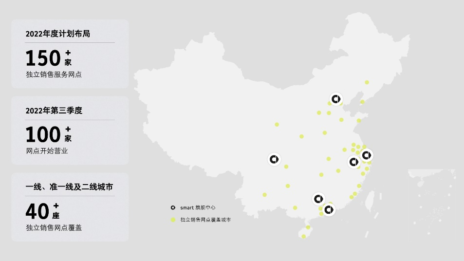 smart今年将有超过150家独立销售服务网点完成布局。预计到第三季度,smart会有100余家独立销售服务网点开始营业,覆盖超过40座一线、新一线及二线城市。
