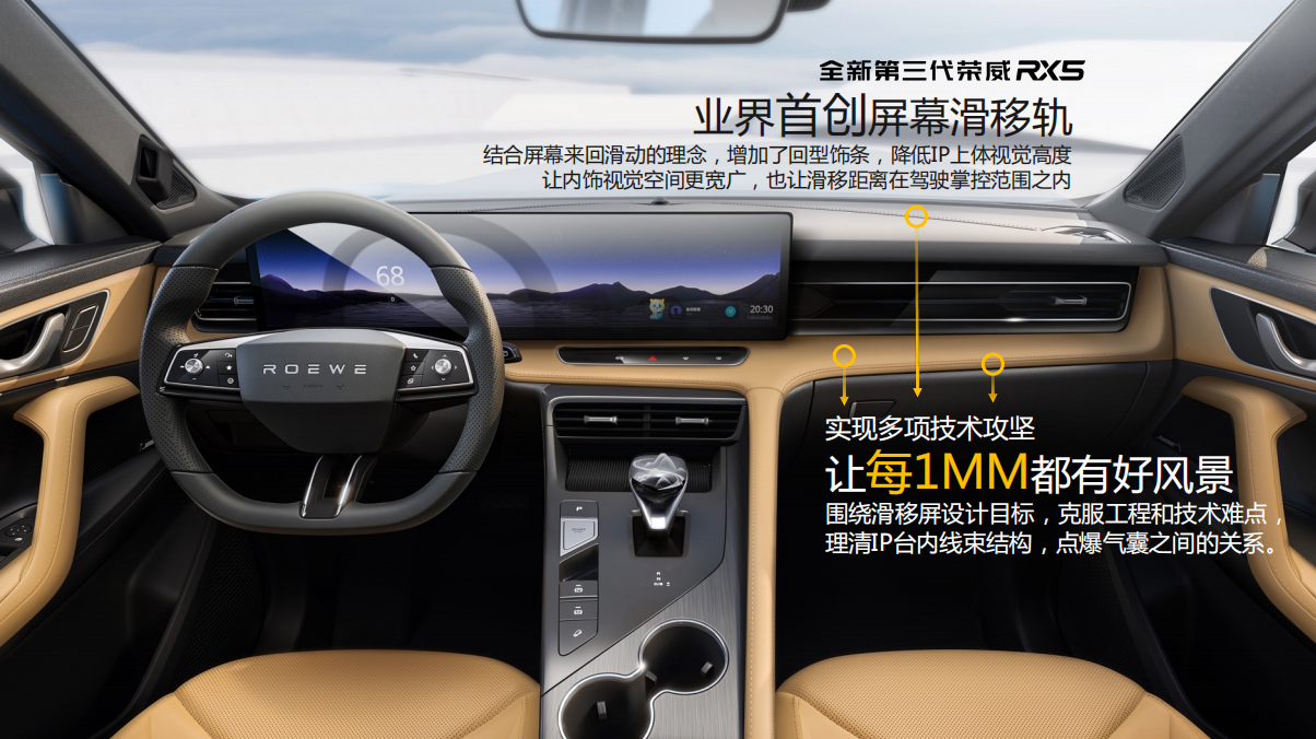 而经过上汽荣威汽车设计师团队的模型多轮验证之后克服困难给出了中控台内布局机构交错设计的答案!得以实现这独创的屏幕滑移技术。