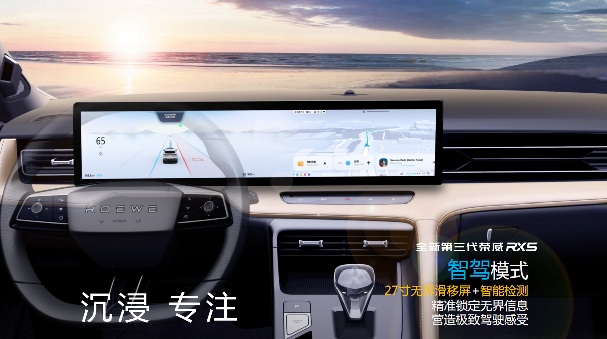 全新第三代荣威RX5智能座舱搭载了全球首创的27英寸全景无界滑移屏幕,在技术上的突破实现屏幕和仪表之间的空间隔阂,带来无界沟通的交互体验。