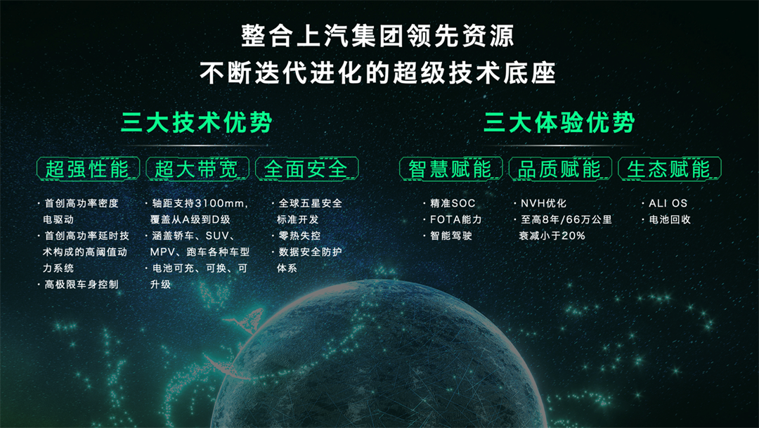 该平台拥有全尺寸带宽,轴距最大支持3米,能满足A-D级车型不同细分市场、涵盖范围轿车、SUV、MPV、跑车各种车型,采用三轴电驱动、双高压平台布局覆盖更广性能表现,电池可充、可换、可升级,实现超大带宽表现。