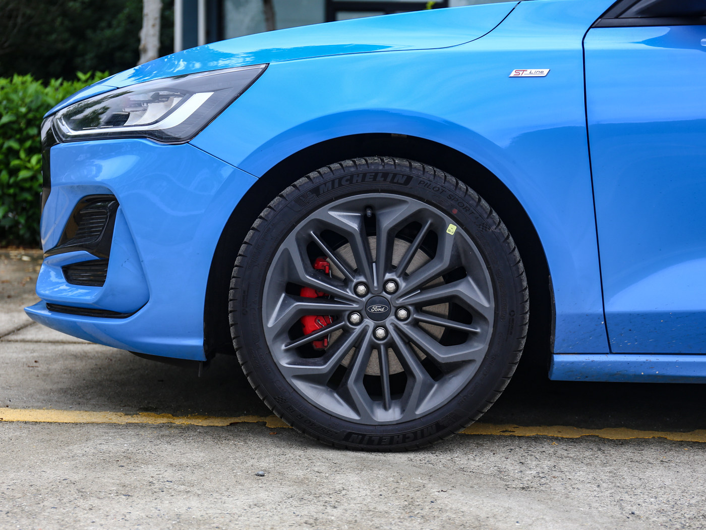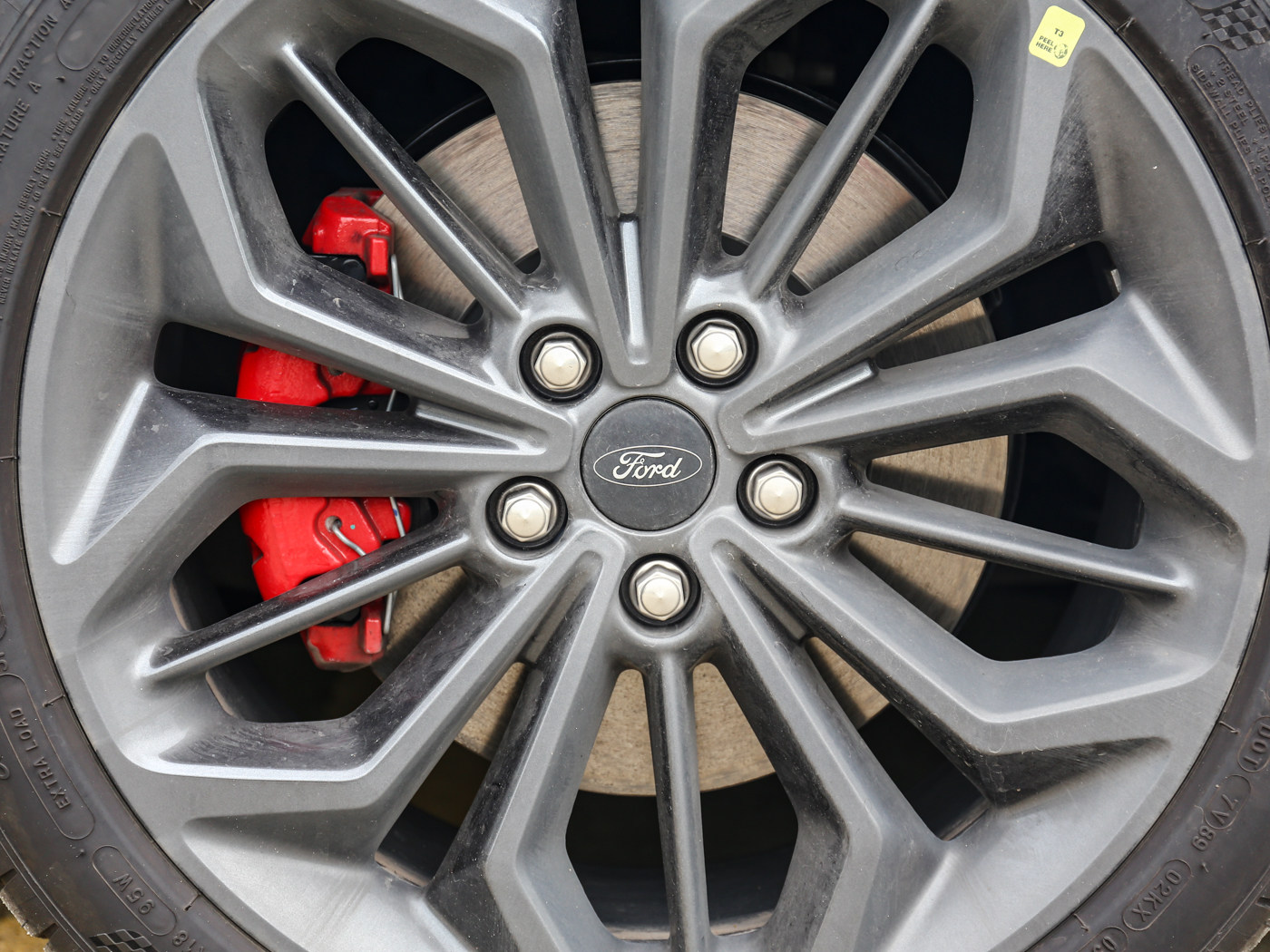 熏黑式花瓣轮毂十分罕见,搭配红色的制动卡钳瞬间拉爆该车的运动氛围。而ST-Line版本车型所配备的是米其林Pilot Sport 4轮胎,数据部分为235/40 R18,这款轮胎是由新一代功能弹性体与硅混合的配方而成,能够提供优异的抓地力表现。
