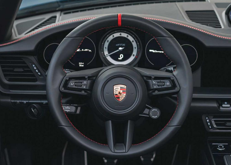内饰布局同样延续保时捷911 GTS Cabriolet这一套,一如既往保留有保时捷经典的三圆环仪表、中控台上方的圆形时钟表等元素。