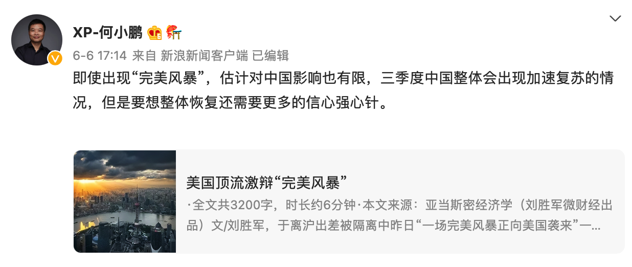 你说造车新势力该不该对此打起十二分精神呢?有意思的是,何小鹏近期发微博称,即便出现美元流动性危机,他认为对中国影响也有限。不过,这会不会是又一次的低估呢?