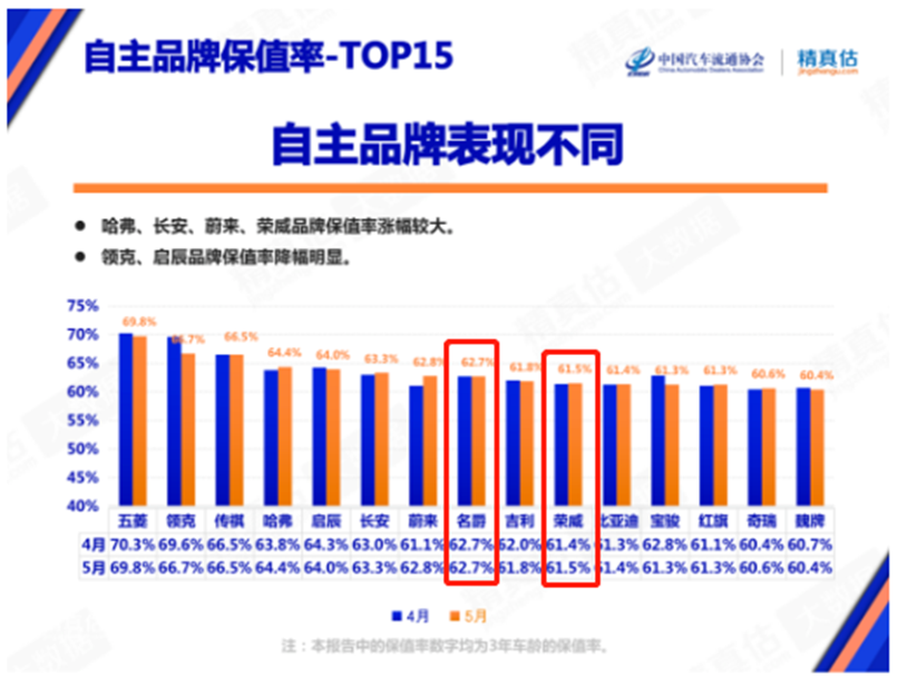 5月,自主品牌保值率相对合资、豪华品牌更为稳定,上汽乘用车旗下荣威、MG双品牌保值率稳中有涨。其中,荣威品牌的保值率为61.5%,较上月有所上涨,位列自主品牌前十;MG品牌保值率达62.7%,占据榜单第八位。